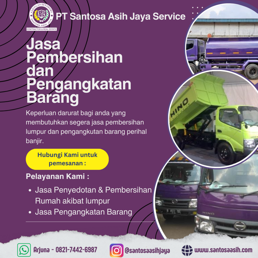 Bingung mau nyari jasa angkutan barang atau jasa penyedotan serta pembersihan rumah akibat lumpur dan sisa air? Nggak usah bingung, kini Santosa Asih Jaya telah hadir siap membantu Anda dalam pengangkutan barang ataupun pembersihan rumah.